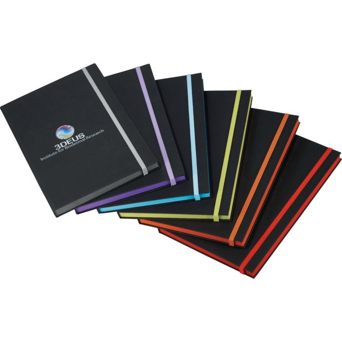 Part of the Sour Punch Trend Collection, this journal will brighten your day with color. 96 sheets of lined paper feature bright colored edges. Corresponding color elastic closure. Soft matte black cover highlights the most subtle or colorful logos.Debossed imprint