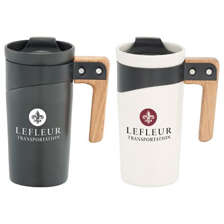 A must-have ceramic tumbler. Matte finish body and natural wooden handle are combined by the black coated stainless steel band. Push-on, slide lock lid included. Up to 3 logo decoration spots are available.16 oz.